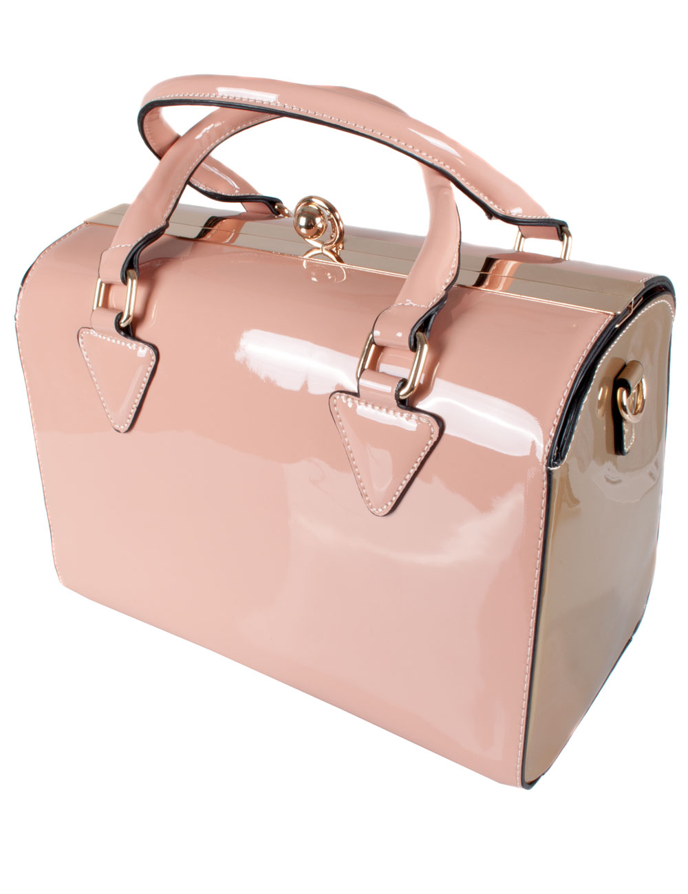 Käsilaukku, vaal.pun/kulta. Vaaleanpunainen kova keinonahkalaukku nepparikiinnityksellä. Korkeus: 20cm, leveys: 30cm ja syvyys: 15cm.