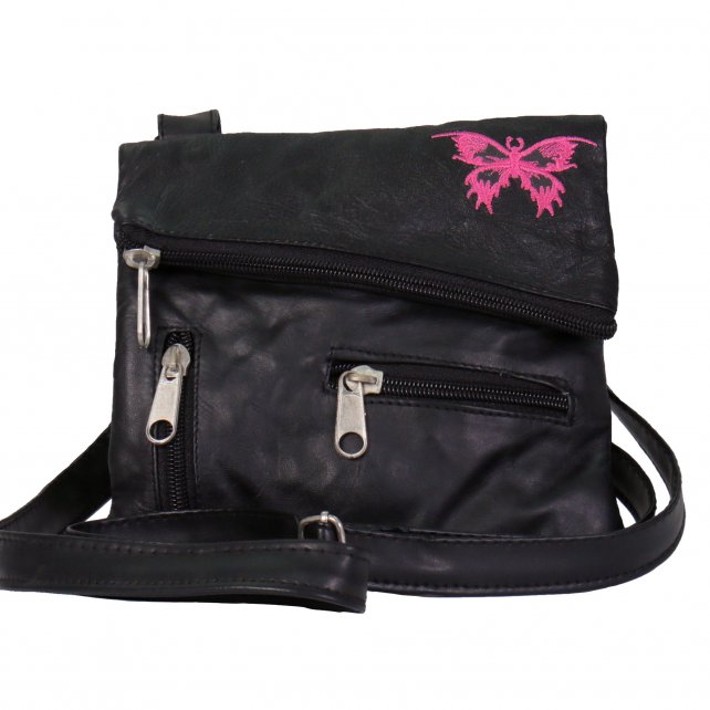 Käsilaukku vyölenkeillä, Hot Leathers. Näppärän kokoisen käsilaukun saa kätevästi kiinnitettyä housun vyölenkkeihin. Tällainen laukku on äärimmäisen kätevä moottoripyöräilijöille, kävelijöille, ratsastajille jne. Valmistettu aidosta nahasta. Laukussa on kaunis perhosbrodeeraus, sekä kaksi pientä vetoketjutaskua. Laukun mukana tulee myös säädettävä olkahihna. Laukun mitat 19 cm x 17 cm.