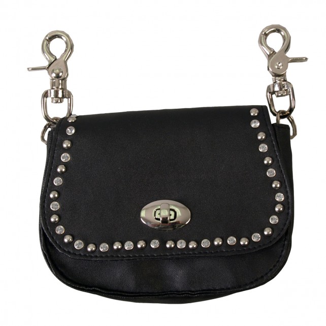 Käsilaukku, Hot Leathers. Näppärä käsilaukku / kukkaro, jossa tekojalokivi reunus. Laukun mukana tulee irroitettava ja säädettävä olkahihna. Laukun saa myös näppärästi vyölenkkeihin kiinni. Laukun koko 16 x 12 x 4 cm.