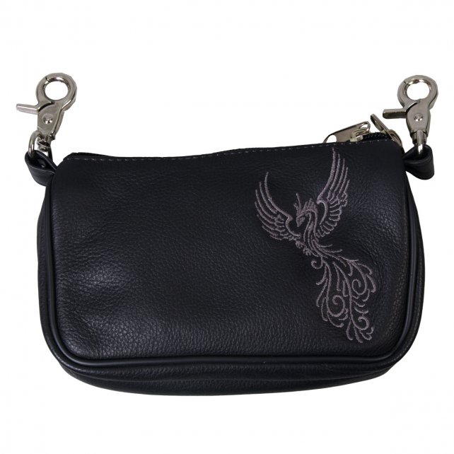 Käsilaukku vyölenkeillä, Hot Leathers. Näppärän kokoisen käsilaukun saa kätevästi kiinnitettyä housun vyölenkkeihin. Kätevä esim. moottoripyöräilijöille, kävelijöille, ja kaikille, jotka haluavat kulkea huolettomasti. Valmistettu aidosta nahasta. Laukku suljetaan yläreunasta vetoketjulla, lisäksi laukussa on yksi vetoketjullinen sivutasku ja kaksi pientä vuorikankaista sisätaskua. Laukussa kaunis feenikslintu-brodeeraus. Laukun mitat: Leveys 20 cm x korkeus 12 cm pohjan leveys 7 cm.