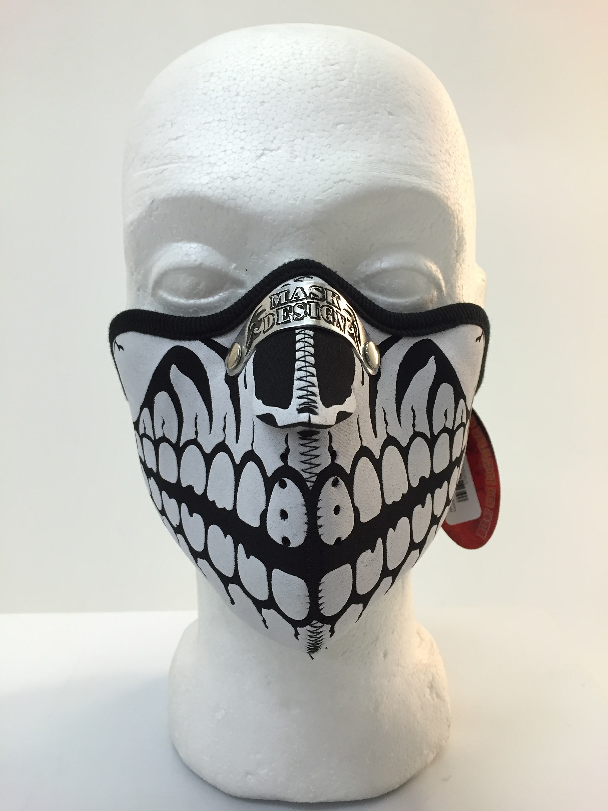 Kasvomaski, luuranko, neopreeni. Neopreenimaski moottoripyöräilyyn. Suojaa viimalta ja lentäviltä öttiäisiltä. Tekstiilitarrakiinnitys maskin takana.