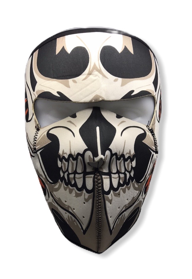 Kasvomaski Tribalskull, neopreeni. Kasvomaski moottoripyöräilyyn, -kelkkailuun tai missä sitten tarvitsetkin suojaa viimalta tai tuiskeelta. Tekstiilitarrakiinnitys maskin takaosassa.