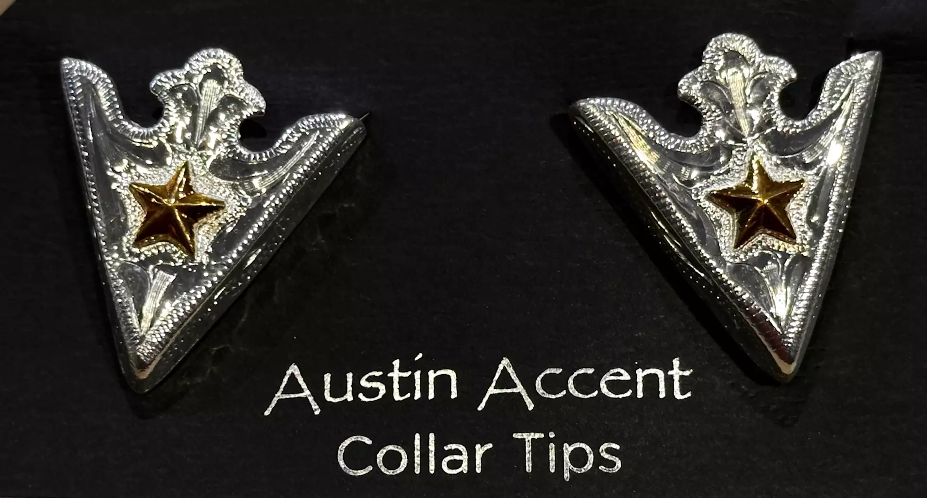 Kaulusklipsi Kultatähti. Paidankauluksen kulmiin kiiltävät metallikulmat kullanvärisillä tähdillä, western-tyyliin. Kaulusklipsin taustapuolella on kiristysruuvi, jonka avulla kulmat kiinnitetään.