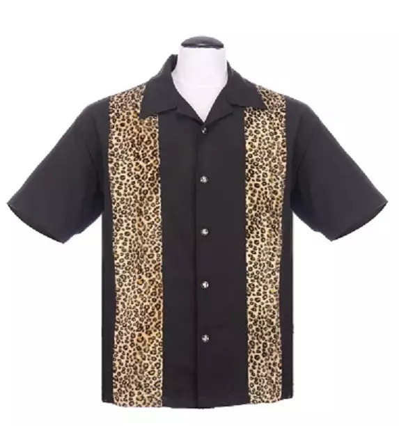Kauluspaita Bowling Shirt, Leopard. Musta kauluspaita, Bowling Shirt, kahdella leopardikuosisella tekoturkisraidalla.
