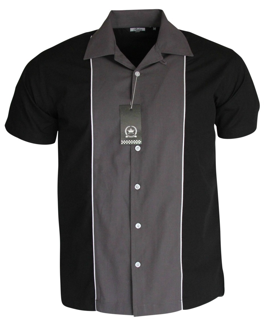 Kauluspaita, Bowling Shirt, musta harmaa. Perinteinen keilapaita, jossa keskellä pystyraita tehostevärillä. Materiaalina helppohoitoinen puuvilla-polyesterisekoite. Tarkista kokosi alla olevasta mittataulukosta, koot melko pieniä.