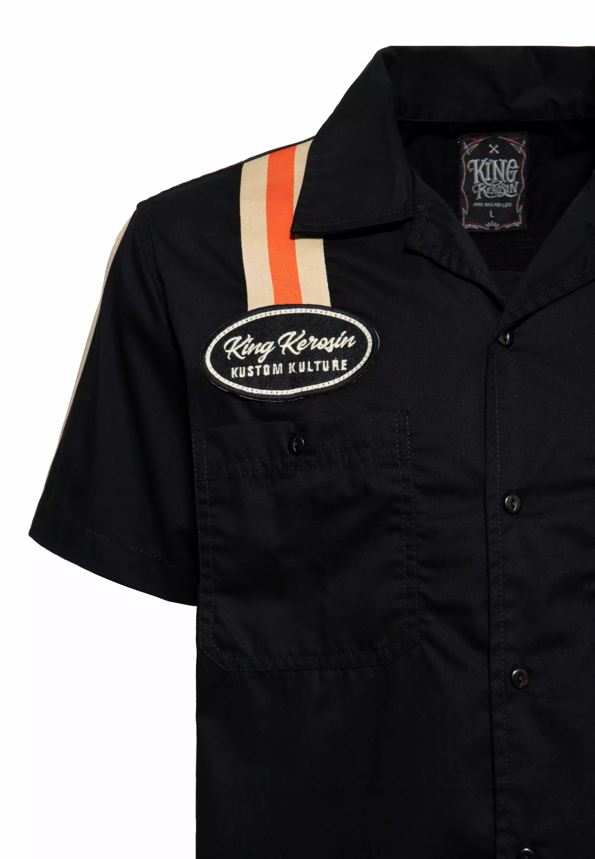 50-luvun tyylinen King Kerosin Racing -paita on pakollinen retromuodin ja kustom-kulttuurin ystäville. Silmäänpistävä "Kustom Kulture" -merkki selässä antaa paidalle erottuvan ilmeen ja juhlii Kalifornian Bakersfieldin luovaa kohtausta. Tämä suuri laastari on todellinen katseenvangitsija ja antaa paidalle ainutlaatuisen luonteen. Syvän mustan muotoilua täydentävät hihoissa olevat kerman ja oranssin väriset kilparaidat, jotka antavat paidalle urheilullisen ilmeen. King Kerosin -logolla varustettu etumerkki vahvistaa aitoa ilmettä. Valmistettu puhtaasta puuvillasta, tämä lyhythihainen paita tarjoaa erinomaisen mukavuuden ja hengittävyyden. Normaali istuvuus takaa mukavan istuvuuden, joka ei ole rajoittava. Litteä käännekaulus lisää klassista ilmettä, kun taas kaksi nappikiinnitettyä rintataskua tarjoavat lisätoimintoja. Tämä paita, jossa yhdistyvät ikoninen vintage-tyyli Kustom Kulturen kapinalliseen estetiikkaan, on täydellinen valinta kaikille, jotka haluavat tehdä muodin.