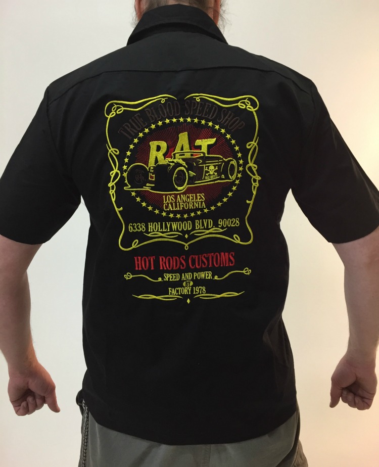 Kauluspaita, RAT, Hot Rod Customs. Miesten lyhythihainen workerpaita, materiaali 100 % puuvillaa. Brodeeratut kuvat sekä edessä rinnassa ja selässä. Rintataskut molemmin puolin. Napitus edessä. Normimitoitus, katso mittataulukko alta.