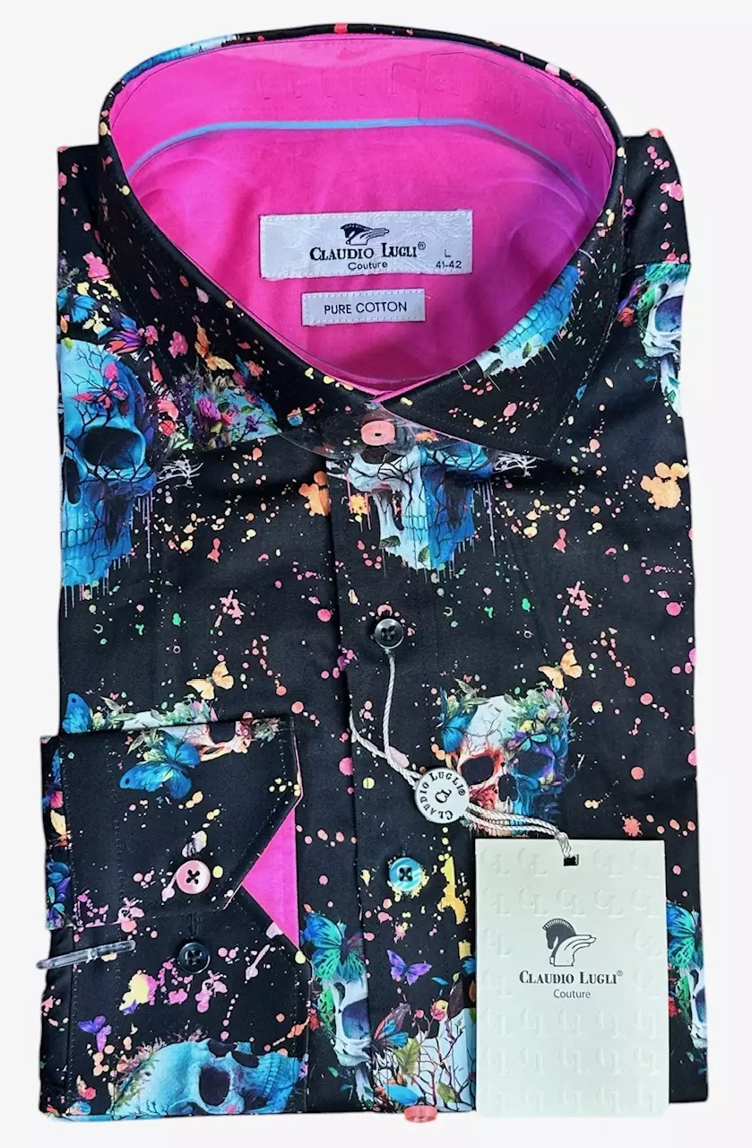 Kauluspaita Splash. Mustapohjainen kauluspaita pääkalloilla ja väriläiskäkuvioilla. Paidassa on eriväriset napit edessä ja hihansuissa, kontrastivärit kauluksen ja hihansuiden sisäpuolella, sekä kauluksen alapuolella. Kauluksen kulmissa on sisäänommellut kaulusluut, ja kauluksen alapinnalla on piilonapitus kauluksen kulmien kiinnittämistä varten. Materiaali laadukasta, kiiltäväpintaista puuvillaa.