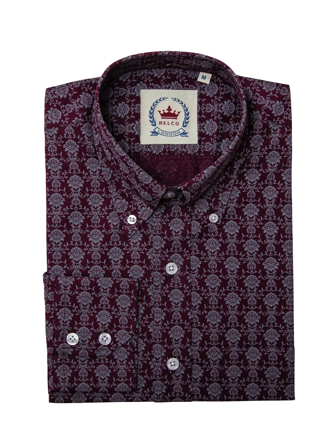 Kauluspaita, viininpunainen. Miesten pitkähihainen kauluspaita. Paidassa pientä, koristeellista ornamenttikuviota vaaleanharmaalla sävyllä. Kauluksen kulmissa, sekä kauluksen takana keskellä pienet napit. Vasemmalla edessä rintatasku. 100 % puuvillaa, hienopesu.