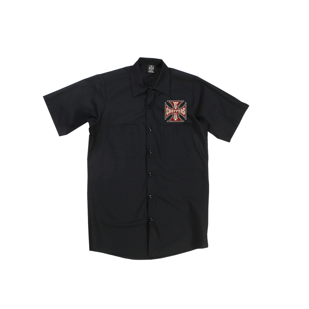 Kauluspaita WCC, isolla logolla, lyhythiha. Musta lyhythihainen West Coast Choppers workerpaita punaisella logolla. Selässä iso logo, vasemmassa rinnassa pieni. Materiaali paksua puuvillapolyesteria (35 % puuvilla, 65 % polyesteri).