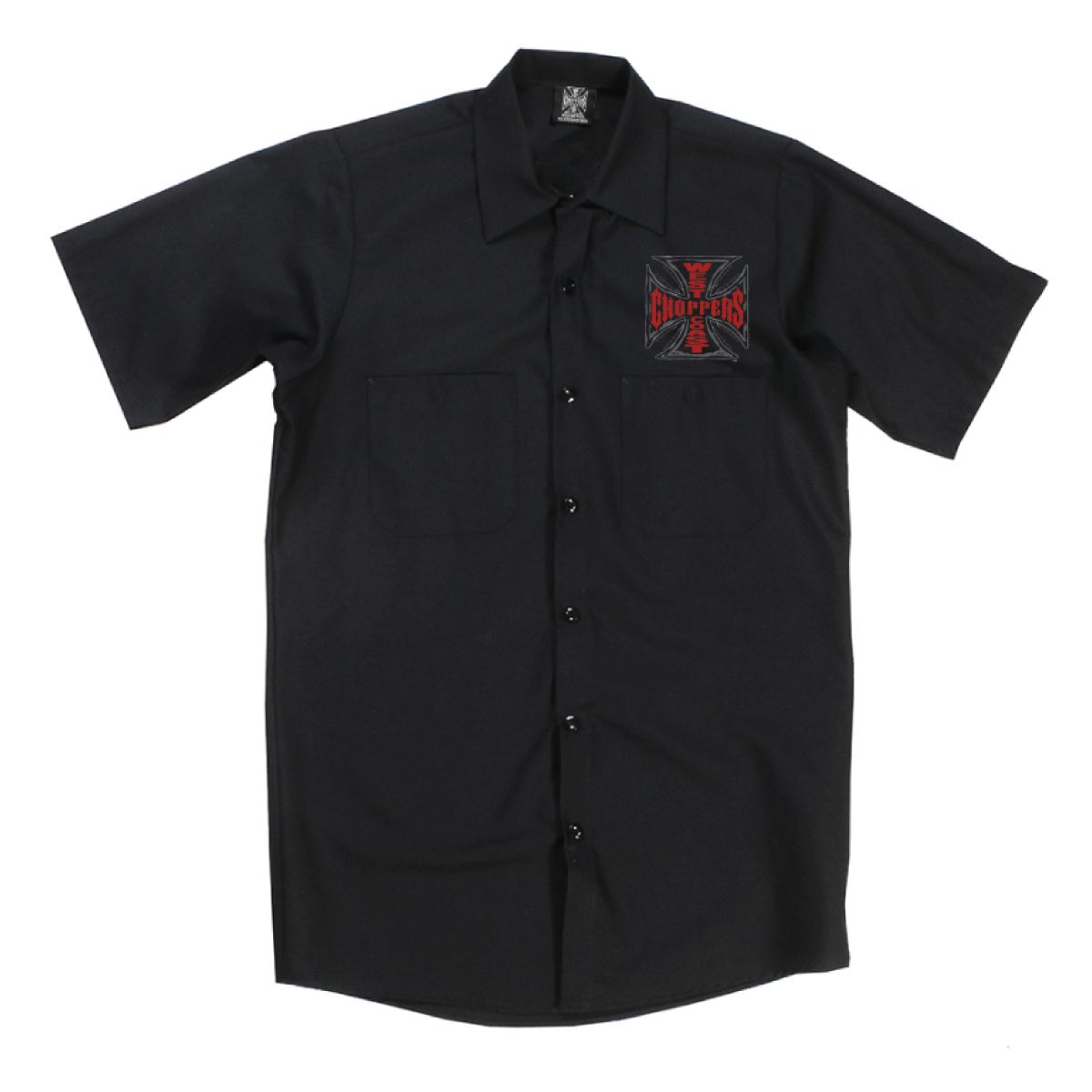 Kauluspaita, WCC, Web Cross Workshirt, black. Musta miesten lyhythihainen kauluspaita, worker-paita, WCC-logolla. Iso painatus selässä ja pieni edessä, vasemman rintataskun yläpuolella. Rintataskut nappikiinnityksellä. Materiaali 35 % puuvillaa, 65 % polyesteria, hienopesu.