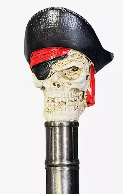 Kävelykeppi Piraatti. Tyylikäs, painava kävelykeppi Piraatti-nupilla. Nupin materiaali polyresiinia. Kepin varsi mustaa alumiiniputkea. Kepin alapäässä kumitulppa. Kepin halkaisija 20 mm ja kokonaispituus n. 90 cm.