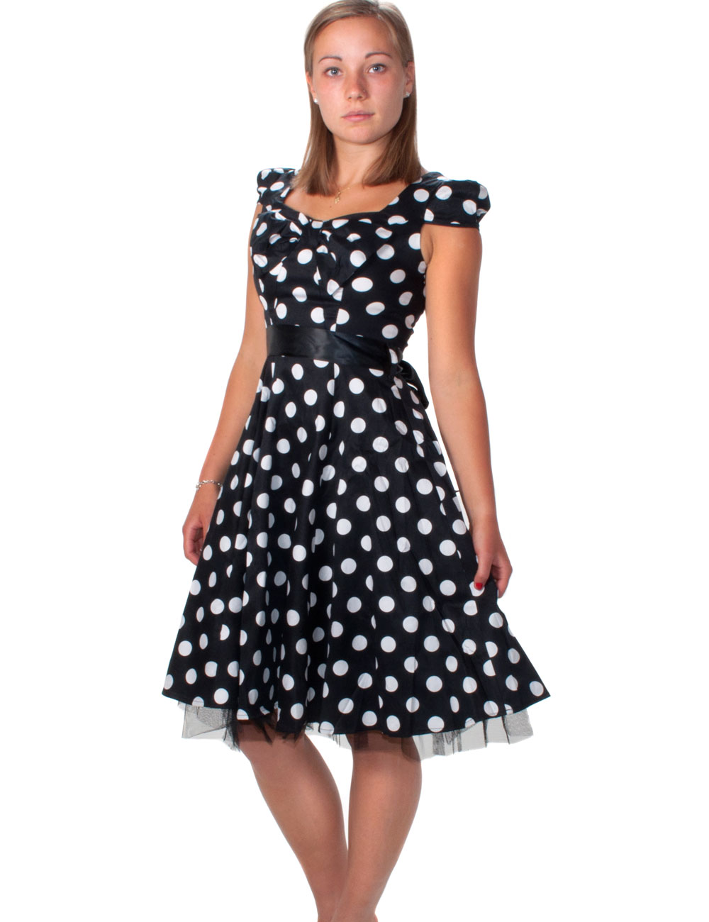 Kellomekko, musta, isot valkoiset pallot. Upea pallokuosinen mekko tyllireunaisella kellohelmalla. Poven kohdalle ommellut muotolaskokset, takaosan resorinauha sekä sivuvetoketju takaavat mekolle täydellisen istuvuuden. Hienoina yksityiskohtina upea rusetti poven päällä sekä solmittava satiininauha vyötäröllä. Kellomekkoon saa vielä enemmän näyttävyyttä lisäämällä mekon alle alushameen/tyllihameen, joka nostaa helmaa enemmän kellomaiseksi.