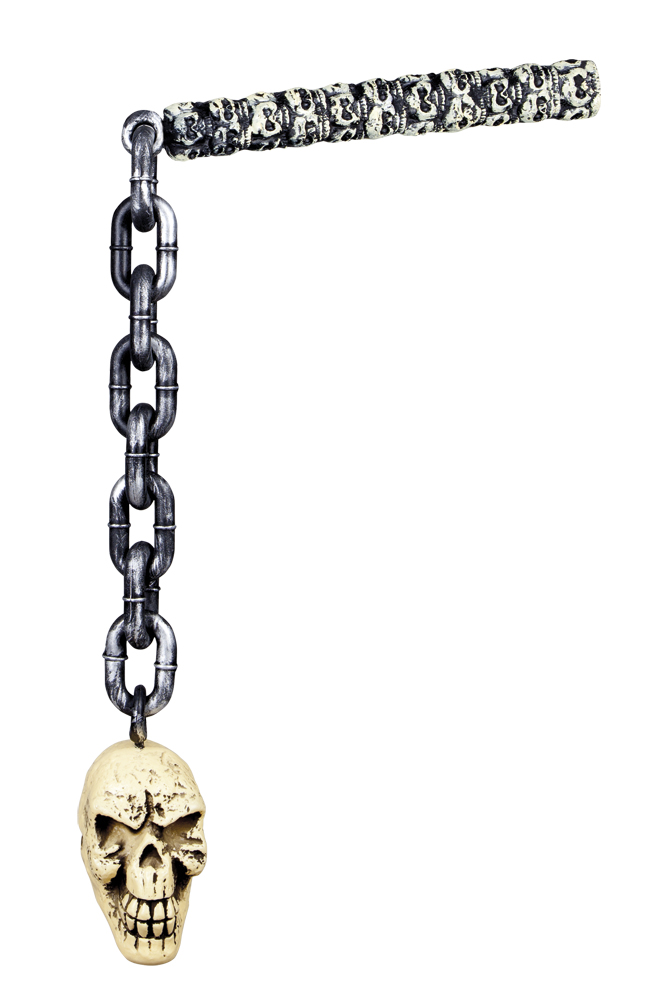 Ketjunuija pääkallolla. Nuijan varressa pieniä kolmiulotteisia pääkalloja. Tämän mahtavuuden kokonaispituus 82 cm. Aidonnäköinen, materiaali muovia.