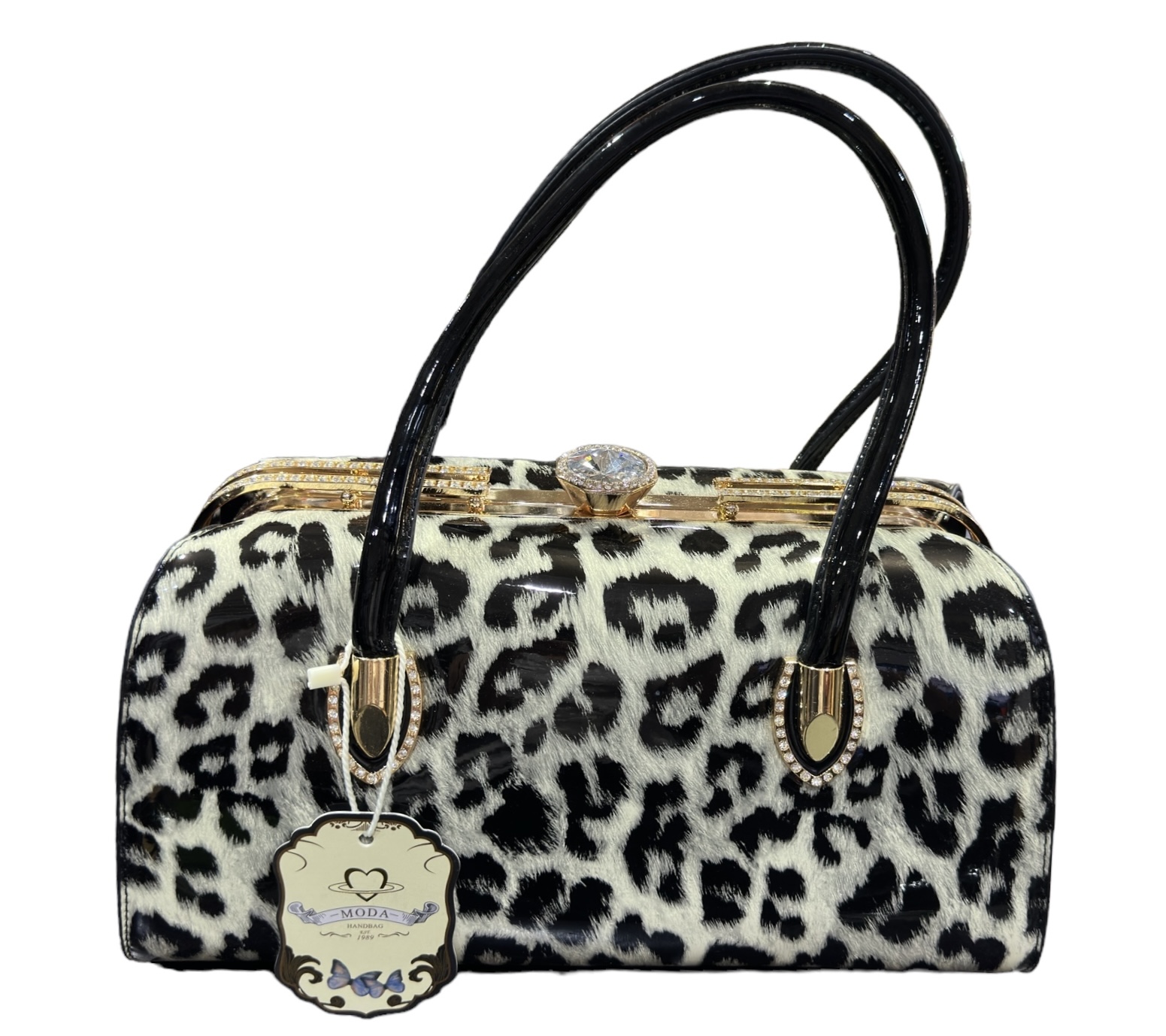 Kiiltävä Leopardi käsilaukku, White-Black. Kova, kiiltäväpintainen keinonahkalaukku kullanvärisin, koristeellisin metalliosin. Laukun sisällä kaksi isompaa laukkuosiota, ja niiden välissä iso vetoketjullinen tasku. Laukun vuorin molemmissa ulkoreunoissa on taskut, toisella puolen vetoketjullinen ja toisella puolen kaksi avonaista. Laukun päällä on katseenvangitsijana iso timantin näköinen koristekivi, joka toimii nepparina laukun sulkemiseen ja avaamiseen. Mukana tulee irroitettava, kantokahvojen kanssa samanvärinen olkahihna.