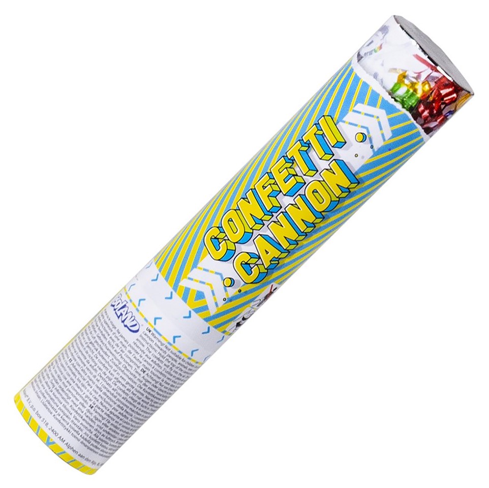 Konfettitykki 20 cm, monivärinen folio. Varoitus ! Vain aikuisten käyttöön. Tarkoitettu käytettäväksi ulkona ja suurissa tiloissa. Varo avotulta. Älä suuntaa tuotetta ihmisiin tai eläimiin, äläkä silmiin tai kasvoihin. Pidä tykki aina suunnattuna poispäin itsestäsi. Jos konfetti kastuu, siitä voi lähteä väriä.