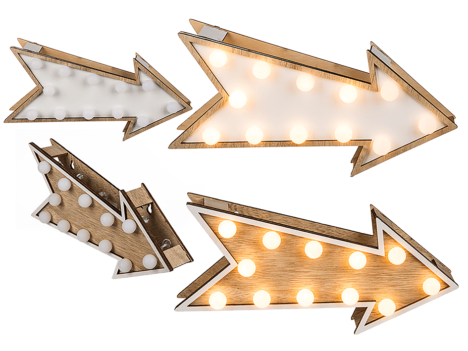 Koristevalo Nuoli 12 lediä, 23 x 10 cm. Puinen nuoli kyltti valoilla. Toimii 2 x AAA paristoilla. Paristot eivät sisälly pakkaukseen.