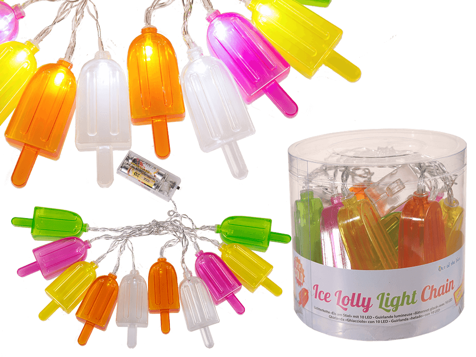 Koristevalosarja Ice Lolly 10 lediä. Valosarjan pituus 1,65 metriä. Toimii 2 x AA paristoilla.