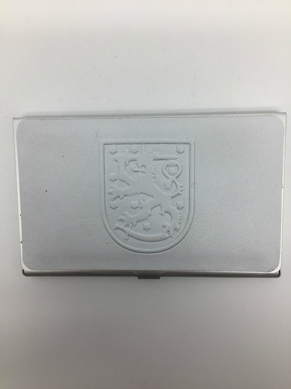 Korttikotelo, RFID suojattu, Leijona valkoinen . Korttikotelo, jossa valkoinen nahkakansi Suomileijona logolla. RFID-suoja tarkoittaa suojausta, jonka ansiosta pankki- ja luottokkortteja ei voi skannata lompakon läpi (lompakossa suojakalvo lompakon nahan sisällä). Lompakon koko 6 x 9,5 cm.