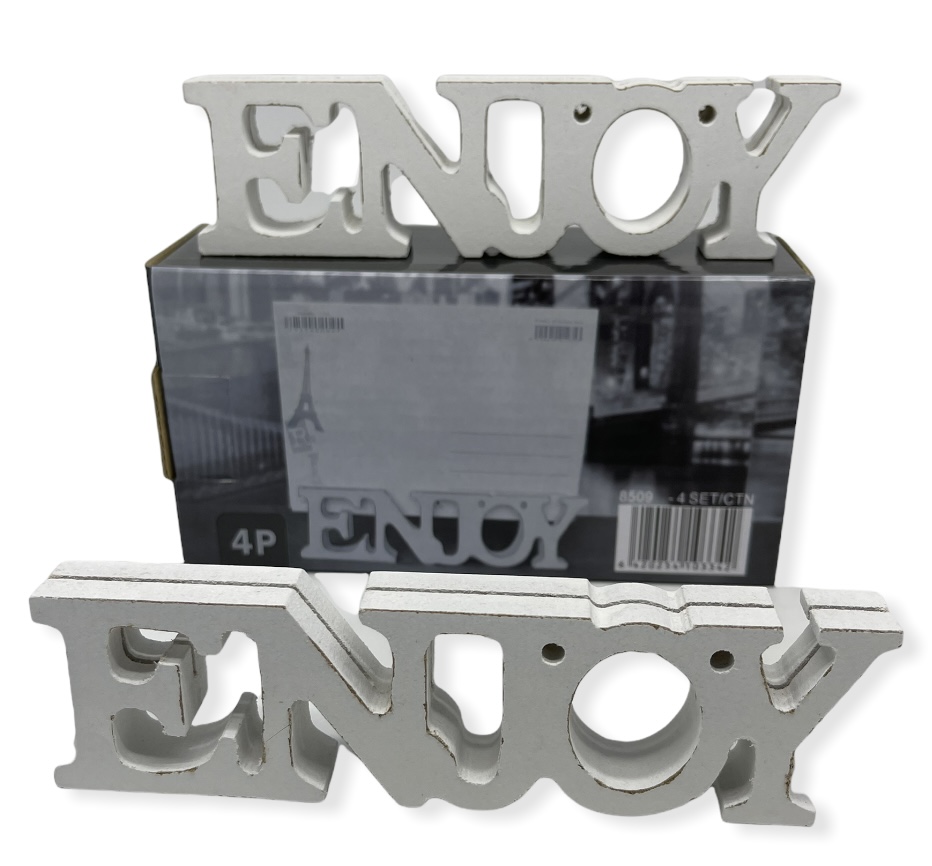 Korttipidike ENJOY. Hauskat valkoiset korttipidikkeet, vaikka istumapaikkojen merkitsemiseen ruokapöydässä. Tai miksei voisi laittaa vaikka kauneimmat postikortit esille hyllyyn pidikkeen avulla. Pakkauksessa on neljä pidikettä, niiden mitat ovat 15 cm x 4 cm, paksuus 1,5 cm, ja ne on valmistettu valkoiseksi maalatutsta kalustelevystä.