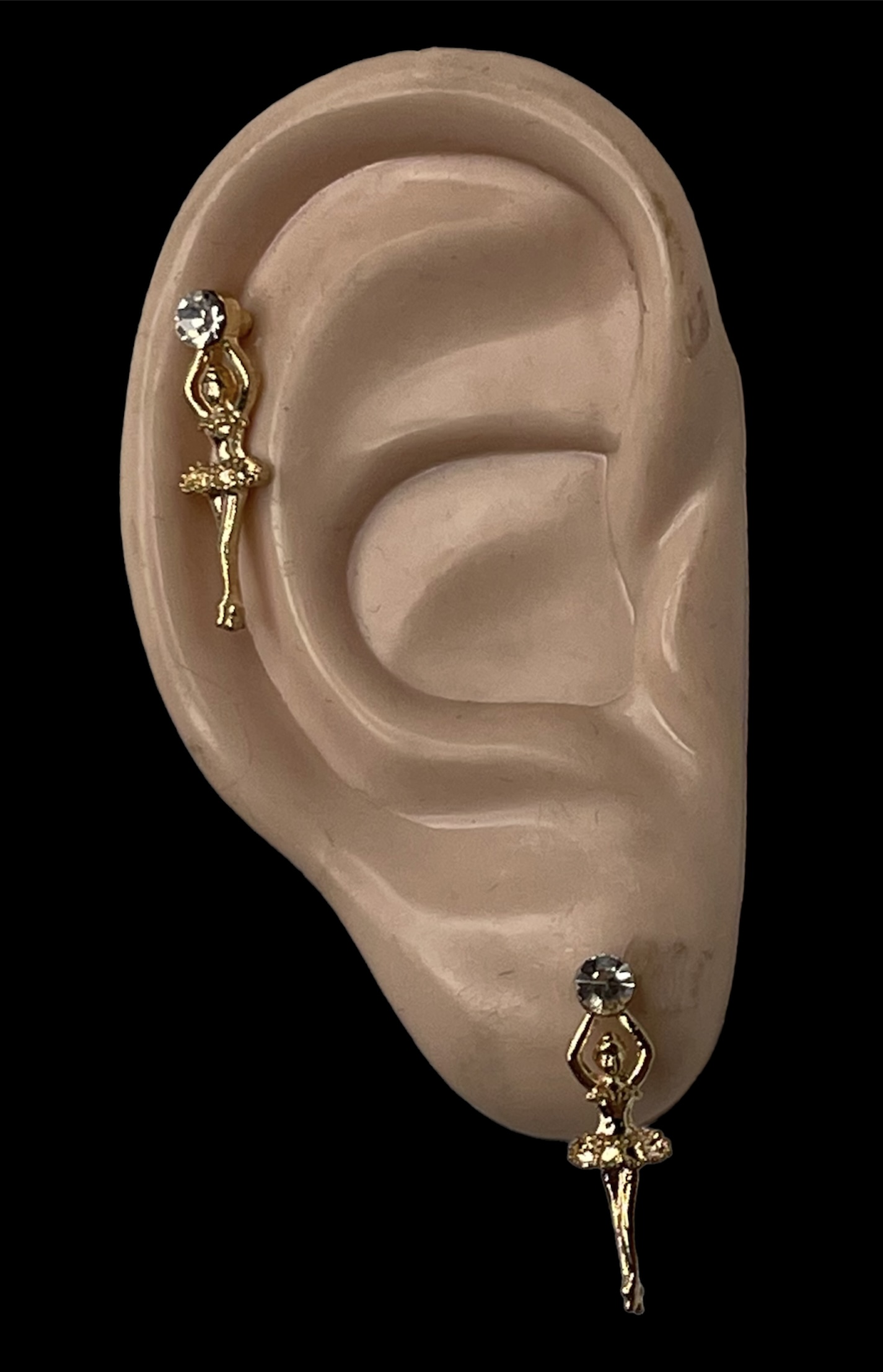Korvakorut Ballet, kullanväri. Korvakorut 2 kpl, nikkelivapaa. Tanssijan koko n. 20 mm.