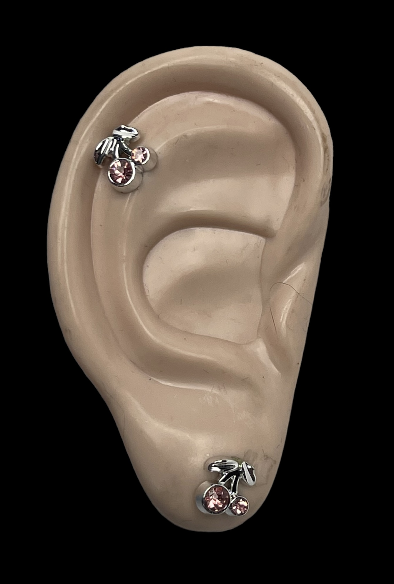 Korvakorut Cherries,vaaleanpunainen. Nikkelivapaat, hopeanväriset korvikset vaaleanpunaisilla koristekivillä.