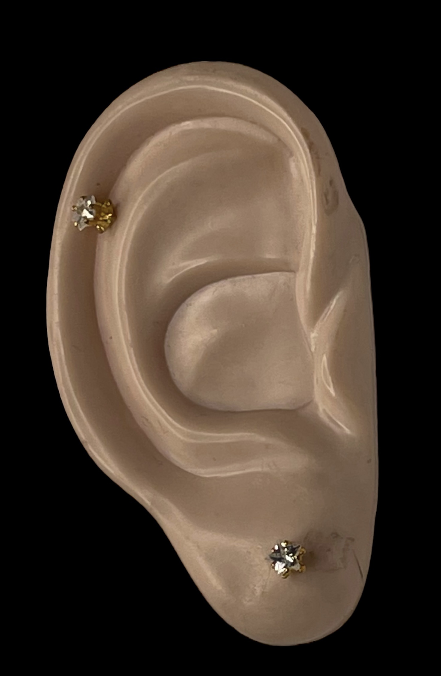 Korvakorut kirkas kivi. Keltakullan värinen runko kirkkalla koristekivellä. Korun halkaisija 4 mm, korkeus 4 mm.