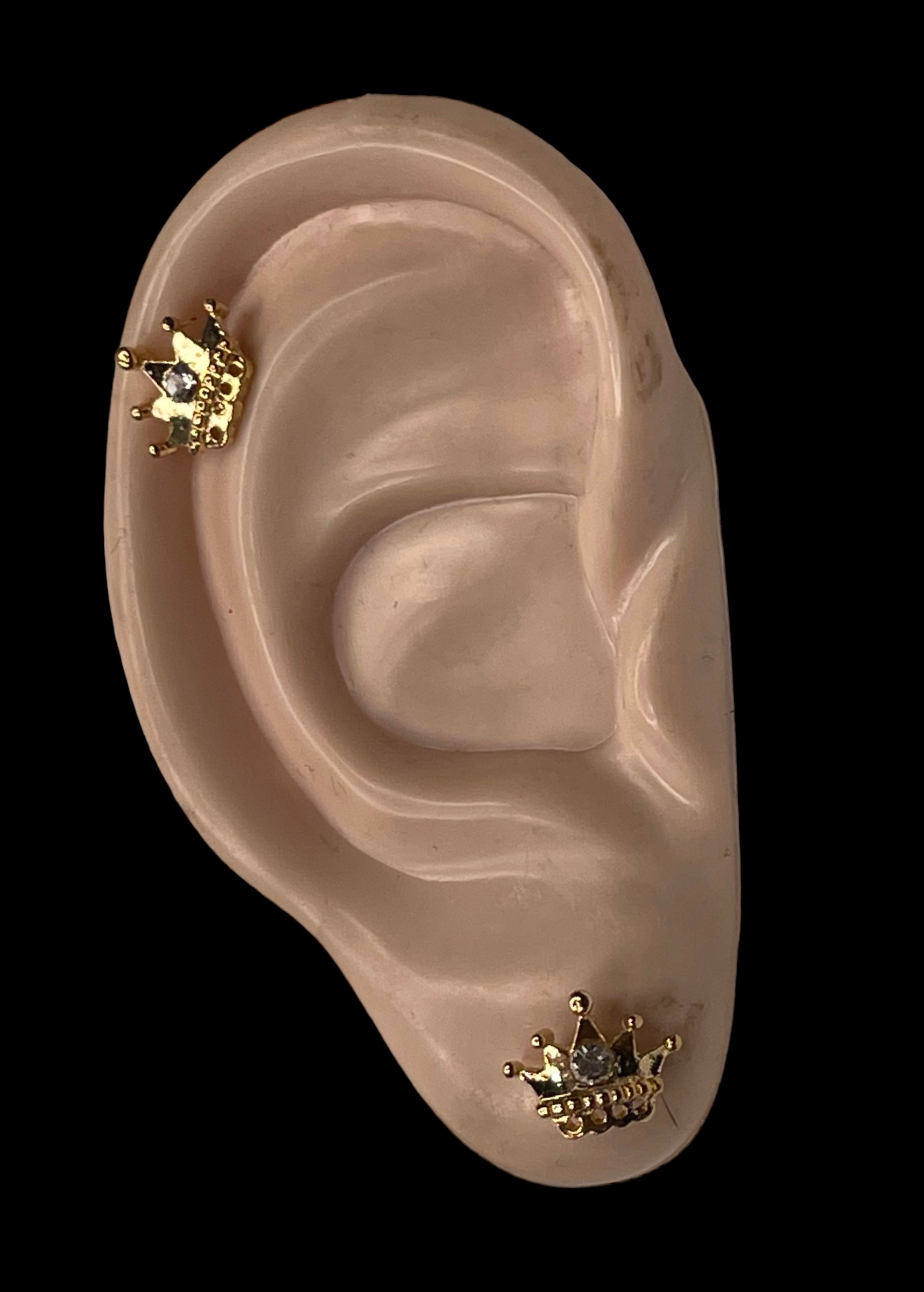 Korvakorut Kruunu 11 x 9 mm. Kullanvärinen kruunukorvis pienellä kirkkaalla koristekivellä.