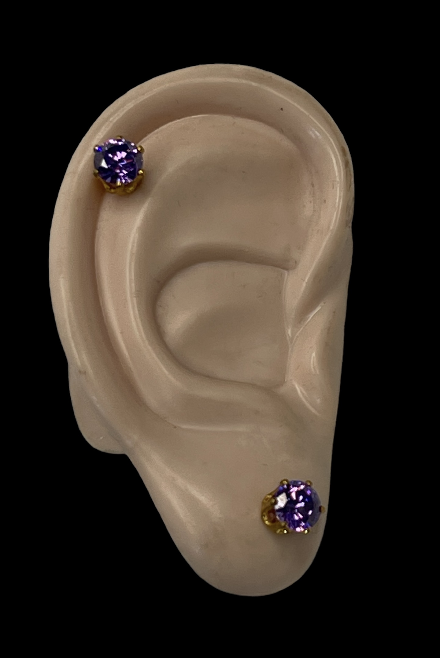 Korvakorut Lila, kulta. Nikkelivapaat korvikset, kullanvärinen koru lilalla koristekivellä.