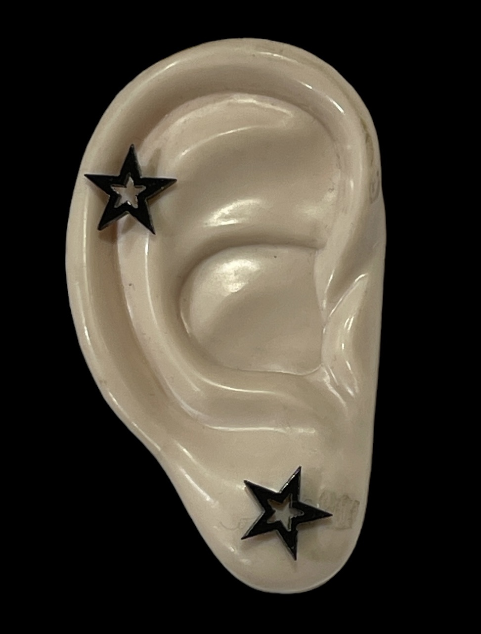 Korvakorut Musta tähti. Tähti muodostuu tähden ääriviivoista, tähden keskiosassa on tähden muotoinen reikä. Sakarasta sakaraan mitta n.10mm. Materiaali muovia.