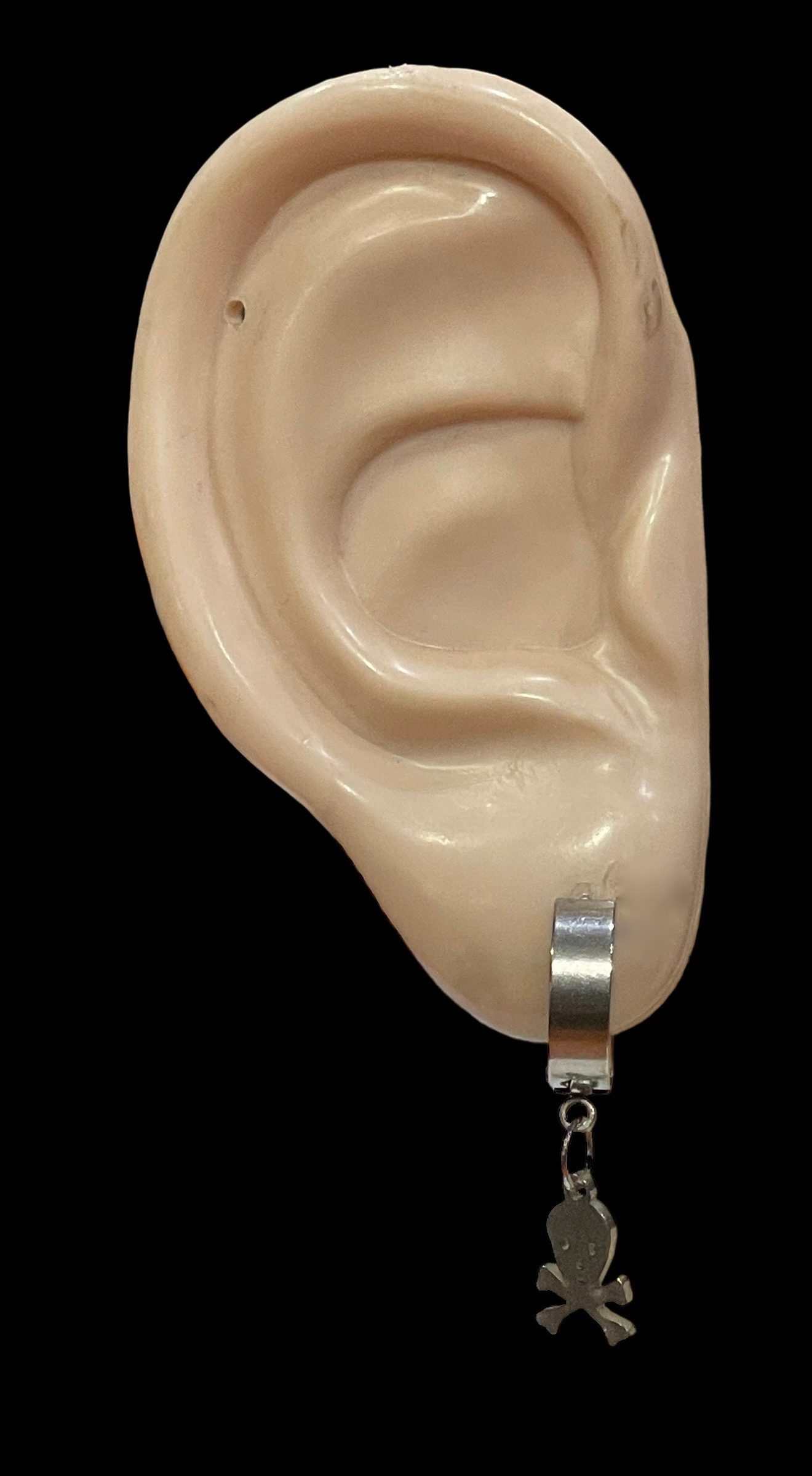 Korvakorut Teräskallo, rengas. Koko korun mitta 30 mm renkaan yläreunasta kalloriipuksen alareunaan, renkaan halkaisija 13 mm. Rengas aukeaa saranalla. Nikkelivapaa.