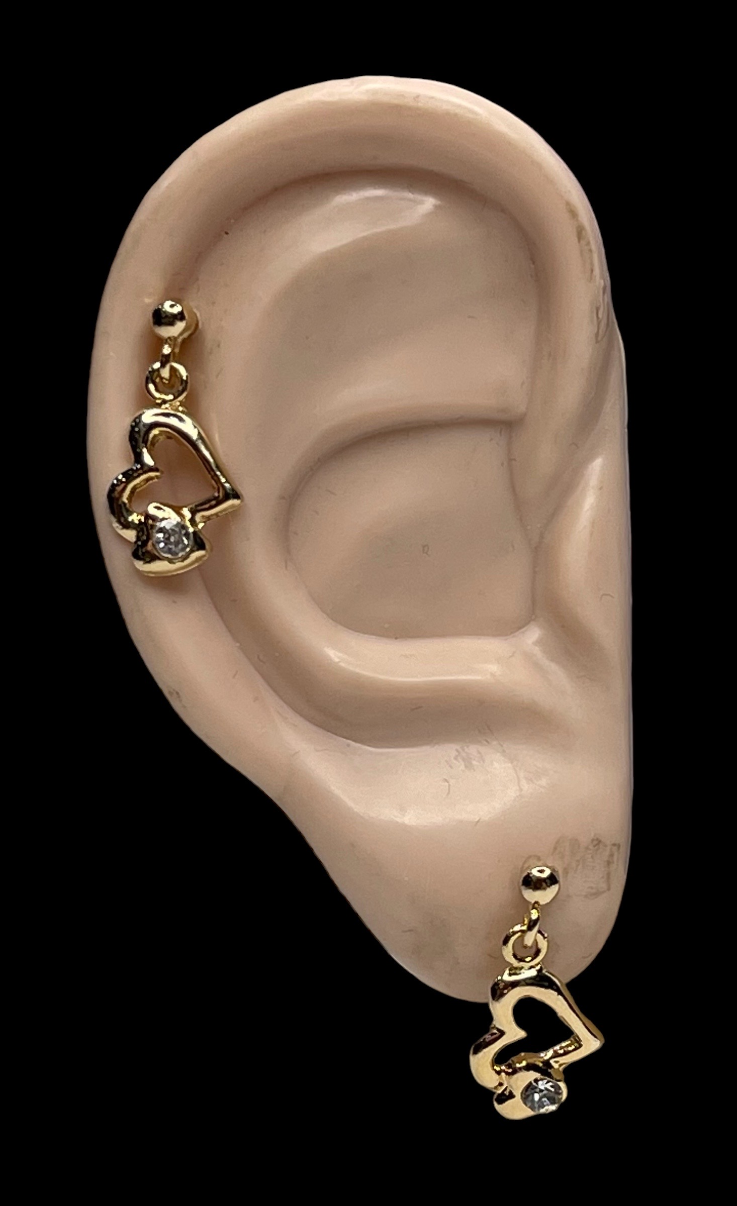 Korvakorut Timanttisydän. Kullanvärinen roikkuva sydänkorvis, jossa kirkas koristekivi. Nikkelivapaa. Korun mitta n. 18 mm.