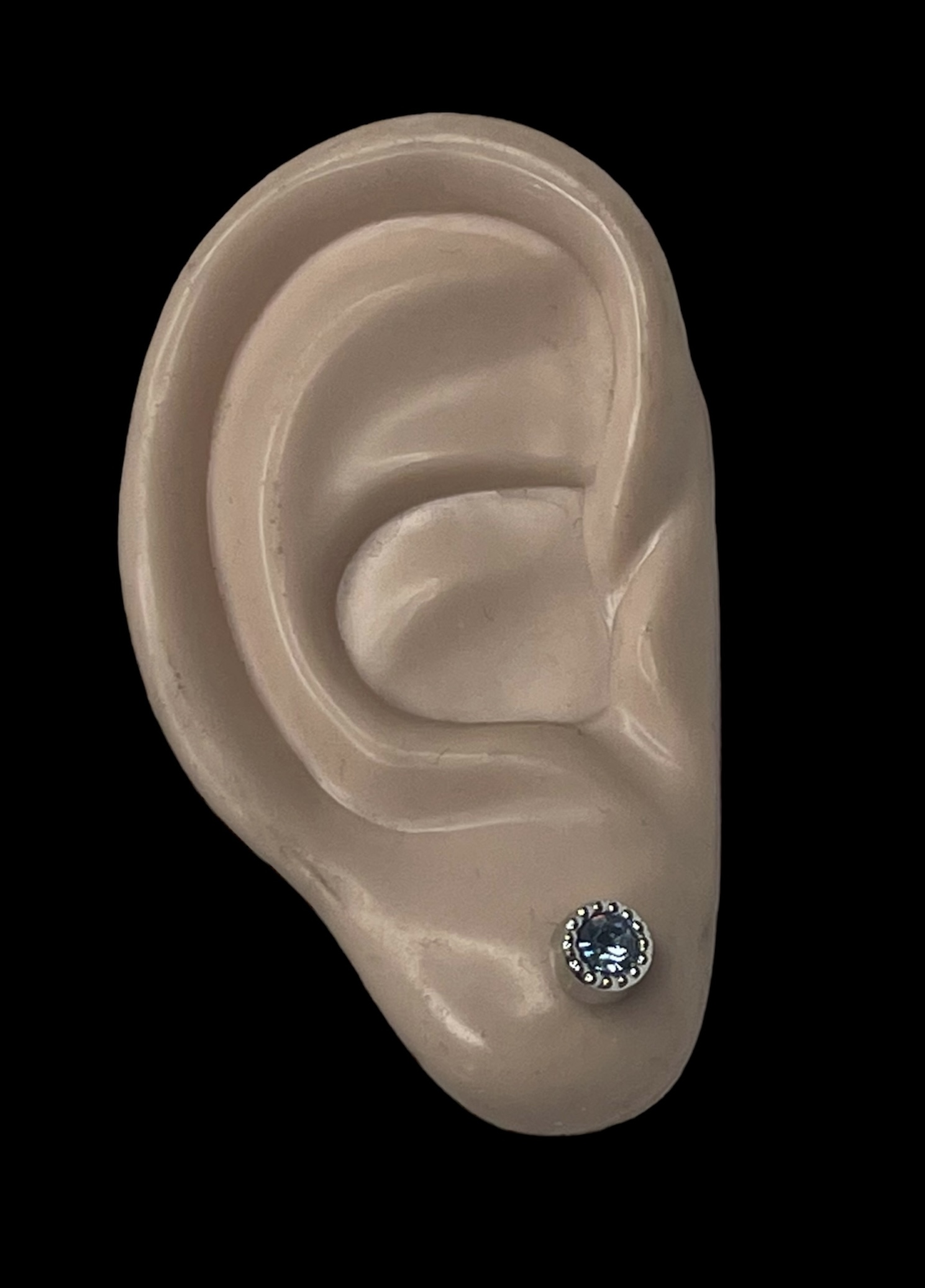 Korvakorut vaaleansininen kivi 6 mm. Nikkelivapaa, hopeanvärinen korvis, jossa vaaleansininen koristekivi. Korun halkaisija n. 6 mm, korun paksuus n. 4 mm.