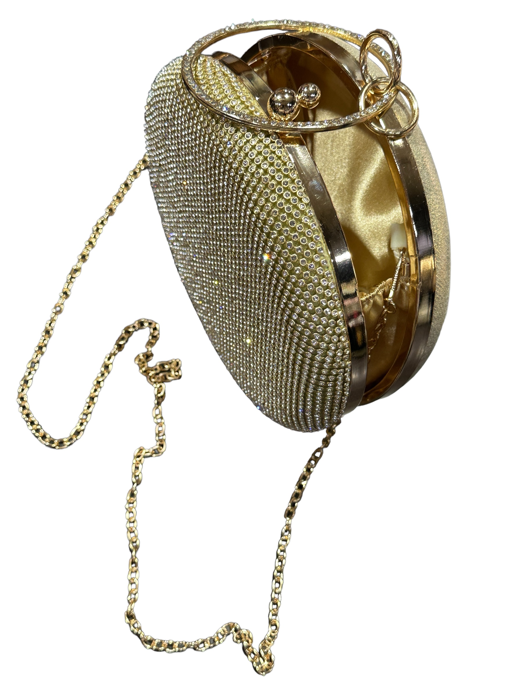 KultaBling Juhlalaukku, Gold. Kova pyöreänmallinen iltalaukku, jossa kimalteleva päälliosa. Laukun halkaisija18 cm ja paksuus 55 mm. Laukussa on rannekorumainen kädensija, joten laukun voi myös pujottaa ranteeseen. Lisäksi mukana irroitettava olkahihna.