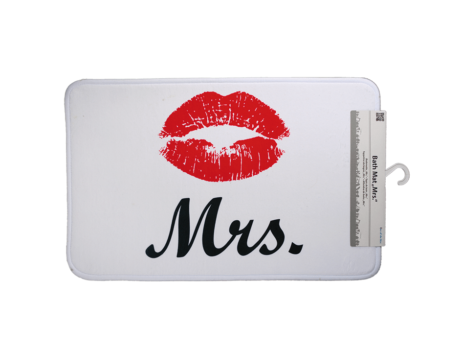 Kylpymatto Mrs. 70 x 45 cm. Kylpyhuoneenmatto jossa huulet ja teksti "Mrs.". Maton koko 70 x 45 cm. Materiaali 100 % polyesteria.