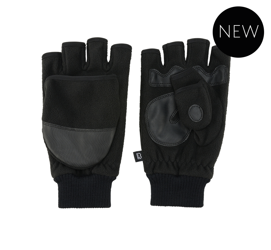 Kynsikäshanska musta, Brandit. Musta hanska, josta saa hanskan ja peukalon kärjen kumoon, jotta saa kynsikästilan käyttöön. Kätevät tarkempaa sormityöskentelyä vaativissa tilanteissa, kädet pysyvät silti lämpimänä. Auki käännetyt osat saa kiinnitettyä tarran avulla, jotta pysyvät paikallaan. Materiaali lämmintä fleeceä, 100 % polyesteria, ja ranteessa joustavat resorit. Koko miesten L-koko, reilu koko.
