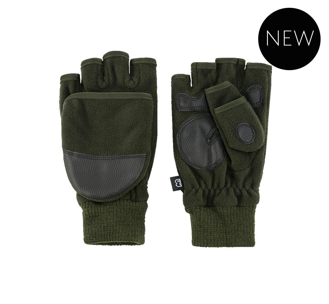 Kynsikäshanska Olive, Brandit. Oliivinvihreä hanska, josta saa hanskan ja peukalon kärjen kumoon, jotta saa kynsikästilan käyttöön. Kätevät tarkempaa sormityöskentelyä vaativissa tilanteissa, kädet pysyvät silti lämpimänä. Auki käännetyt osat saa kiinnitettyä tarran avulla, jotta pysyvät paikallaan. Materiaali lämmintä fleeceä, 100 % polyesteria, ja ranteessa joustavat resorit. Koko miesten L-koko, reilu koko.