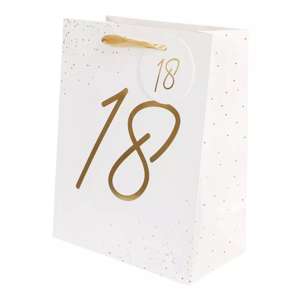 Lahjakassi 18. Valkoinen lahjakassi kullanvärisin tekstein ja nauhoin, mitat 18 cm x 23 cm x 10 cm.