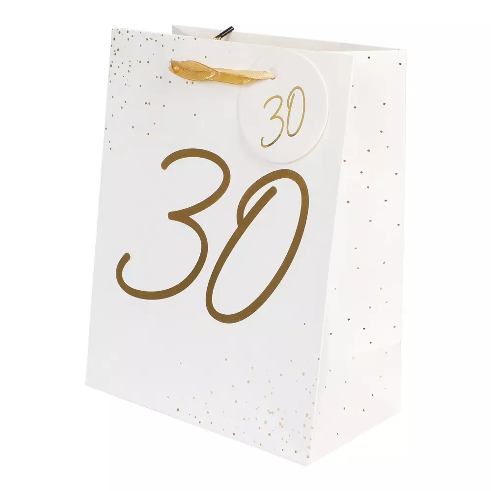 Lahjakassi 30. Valkoinen lahjakassi kullanvärisin tekstein ja nauhoin, mitat 18 cm x 23 cm x 10 cm.