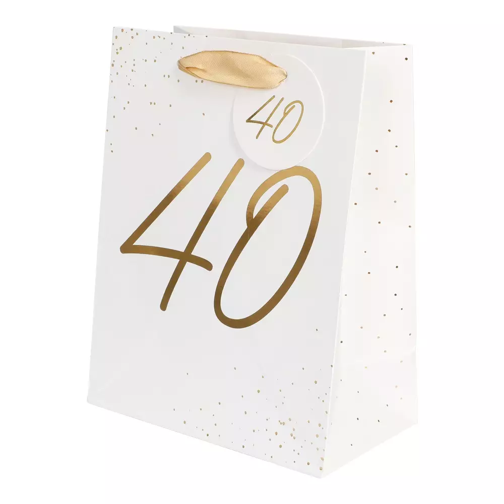 Lahjakassi 40. Valkoinen lahjakassi kullanvärisin tekstein ja nauhoin, mitat 18 cm x 23 cm x 10 cm.