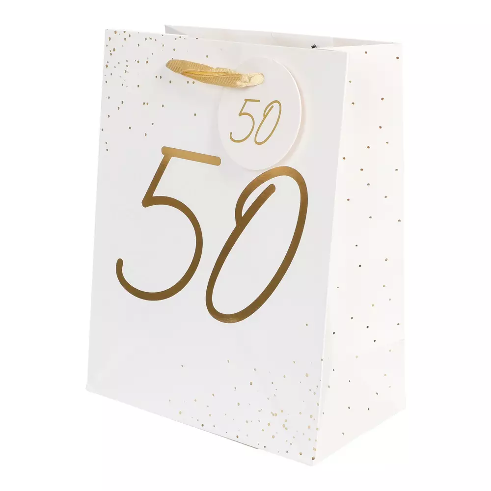 Lahjakassi 50. Valkoinen lahjakassi kullanvärisin tekstein ja nauhoin, mitat 18 cm x 23 cm x 10 cm.