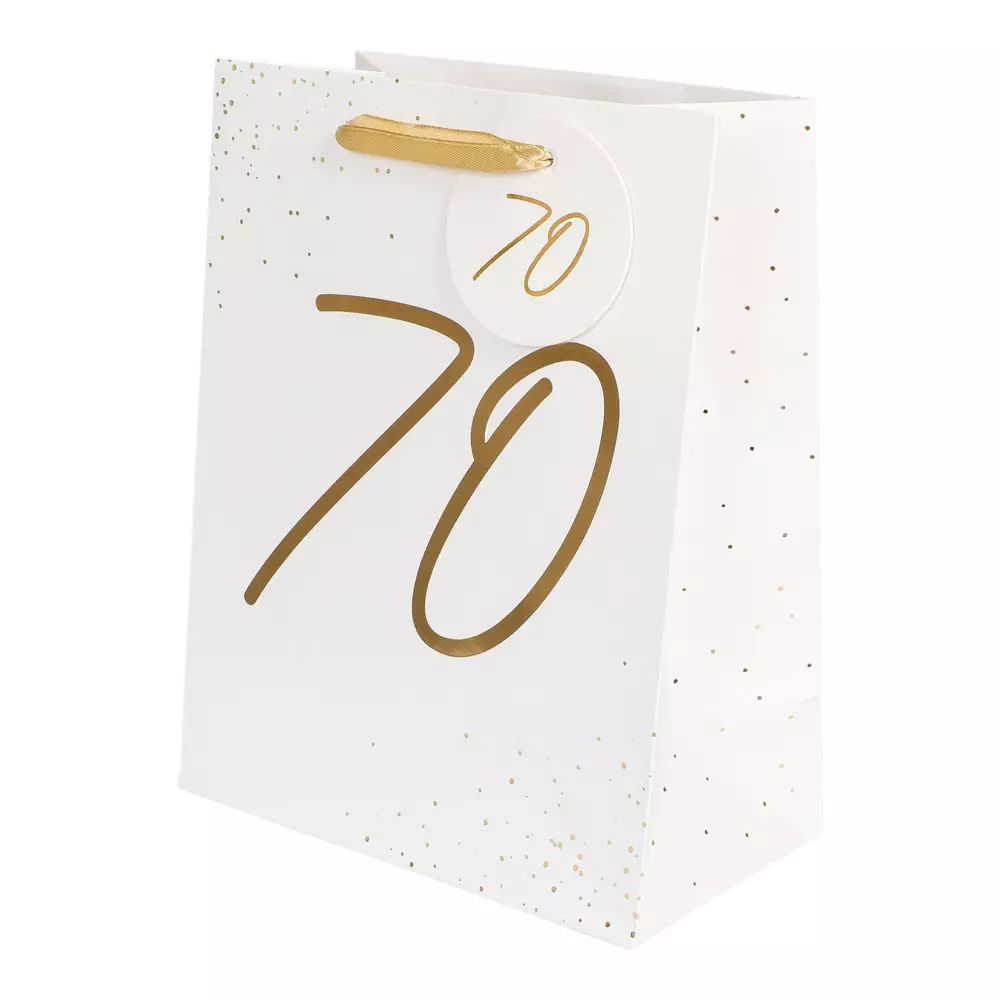 Lahjakassi 70. Valkoinen lahjakassi kullanvärisin tekstein ja nauhoin, mitat 18 cm x 23 cm x 10 cm.