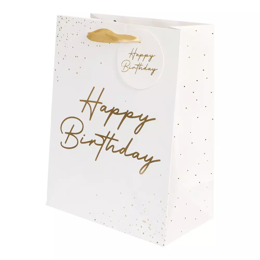 Lahjakassi Happy Birthday. Valkoinen lahjakassi kullanvärisin tekstein ja nauhoin, mitat 18 cm x 23 cm x 10 cm.