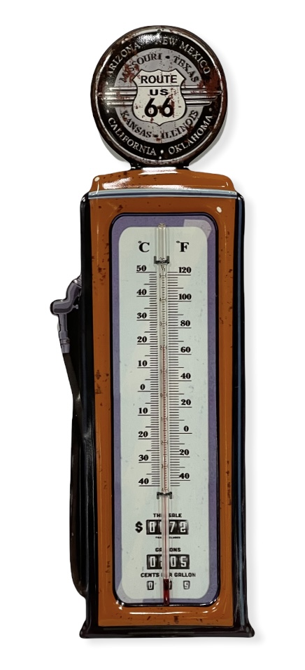 Peltinen lämpömittari Route 66. Lämpötilat sekä Celsius- että Fahrenheit-yksiköillä. Mitat 16 x 48 cm.