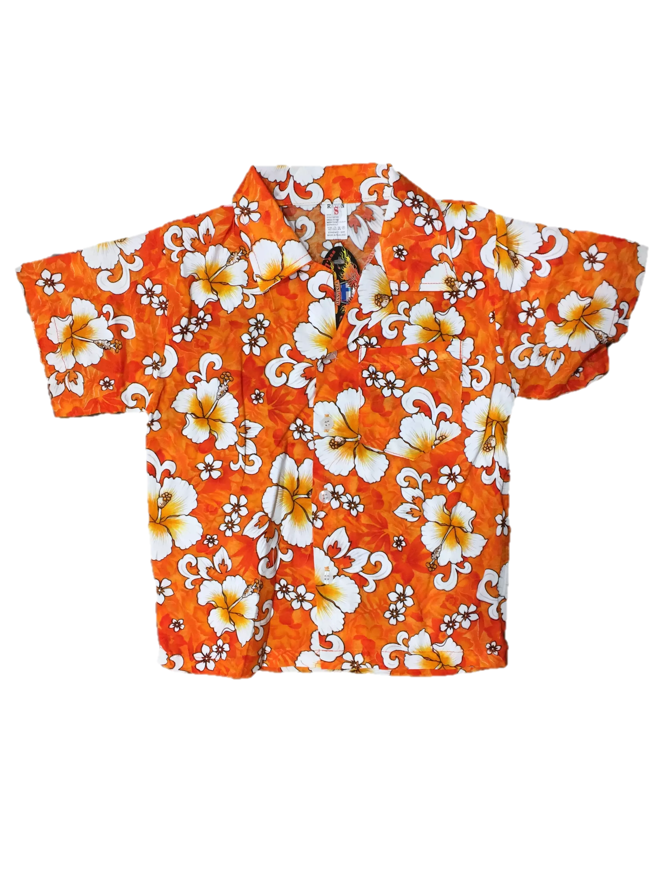 Lasten Havaijipaita, Oranssi, valko-keltaiset kukat. Havaijipaidassa napitus edessä ja rintataku. Materiaali 100 % rayon.
