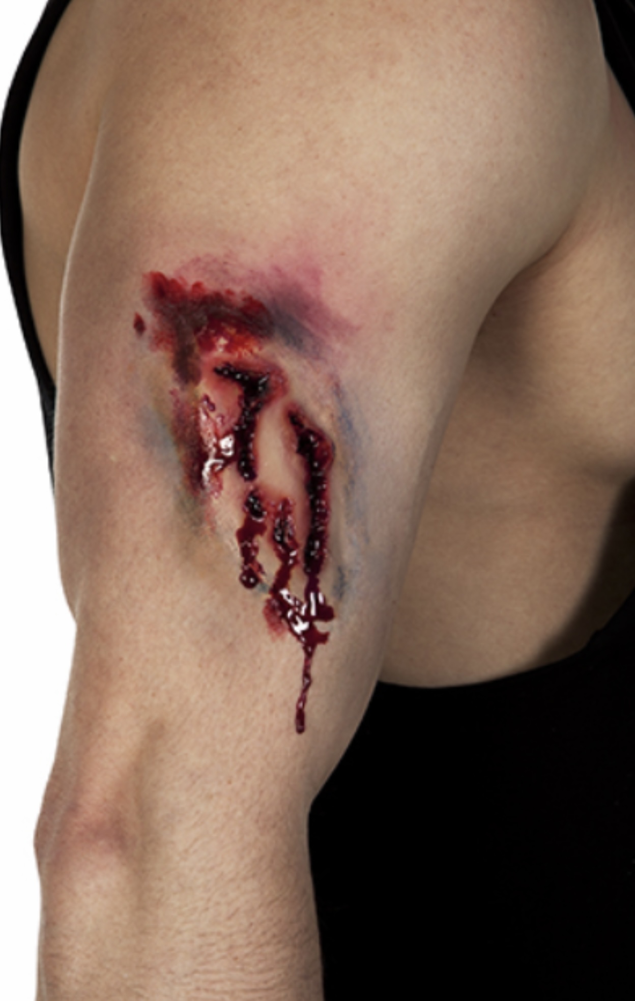 Latex-haava, Halloween. Lateksinen haava, mukana kiinnitystarvikkeet. Koko n. 105 mm x 60 mm. Viimeistele maskeeramalla reunat häivyttämällä tai esim. tekoverellä.