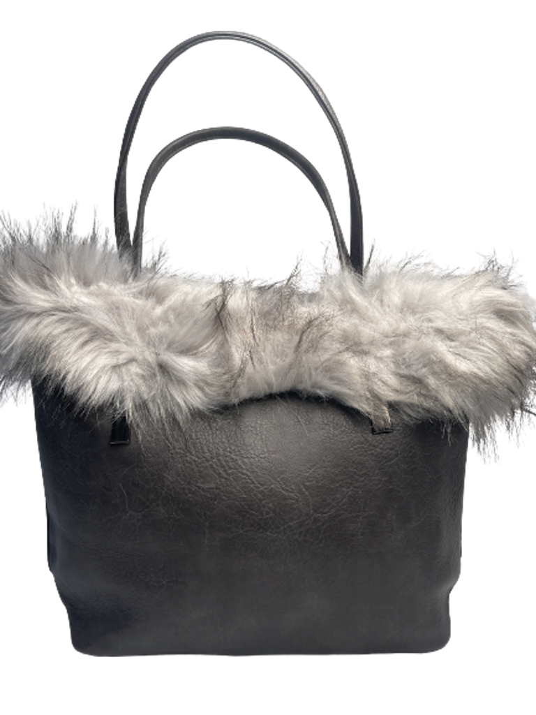 Käsilaukku irroitettavalla olkahihnalla. Karvareuna jonka voi napata netppareista irti. Hyvät taskut lompakolle, avaimille ja puhelimelle, etc. 33 x 30 x 14cm, tukeva pohja et pysyy hyvin pystyssä.
