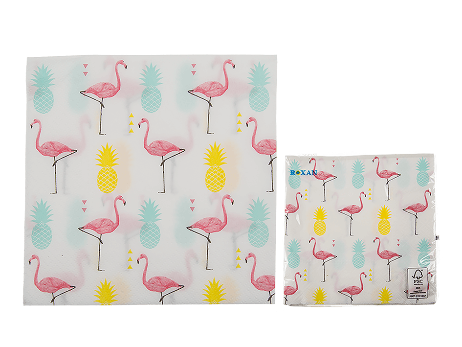 Lautasliina, Flamingo ja Ananas 20 kpl. Lautasliinojen koko 33 x 33 cm. Servetit ovat 3-kerroksisia ja niitä on aina yhdessä pakkauksessa 20 kpl.