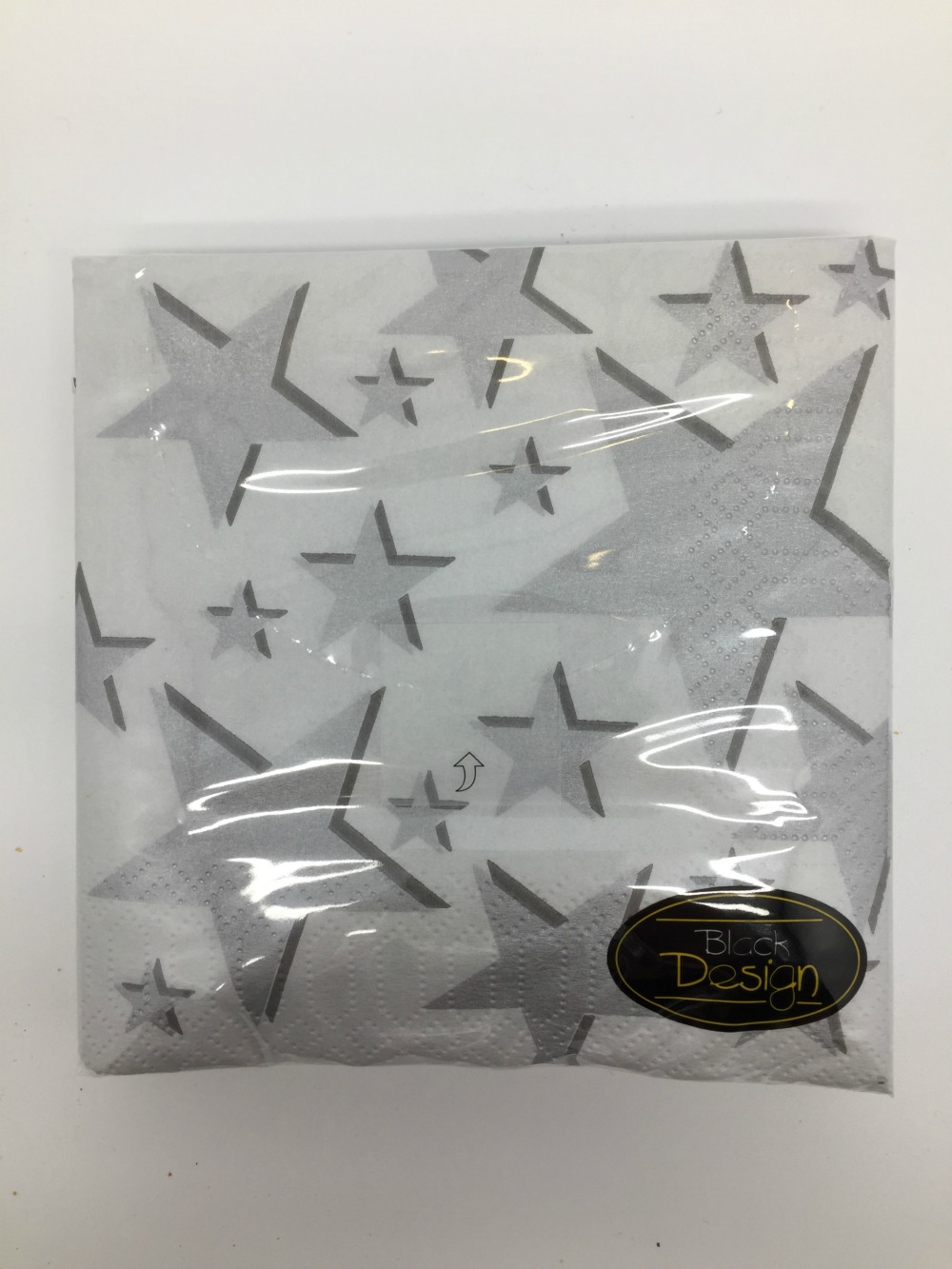 Lautasliina, Stars, white/silver. Servetin koko 25 x 25 cm. Servettejä paketissa 20 kpl.