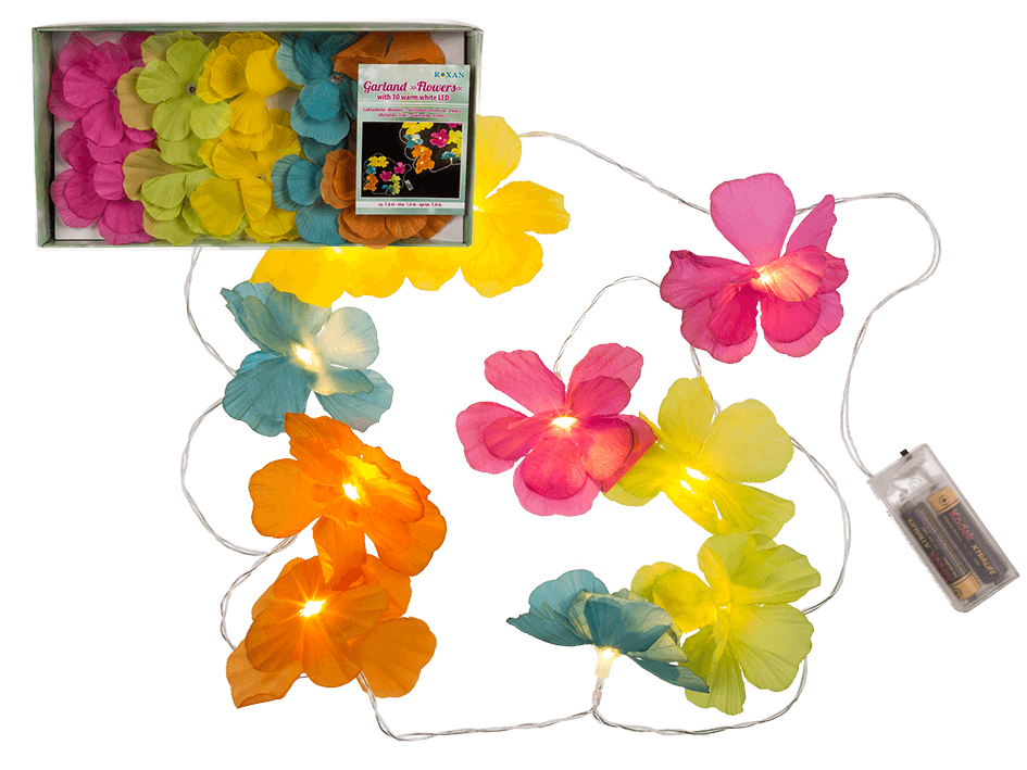 Kukka valot lämmin vakoinen LED valo, 2-kpl AA paristolla toimivat, (ei mukana) 160-cm mitta, 10-kpl kukkia. 10-cm halkaisia. Sisäkäyttöön.